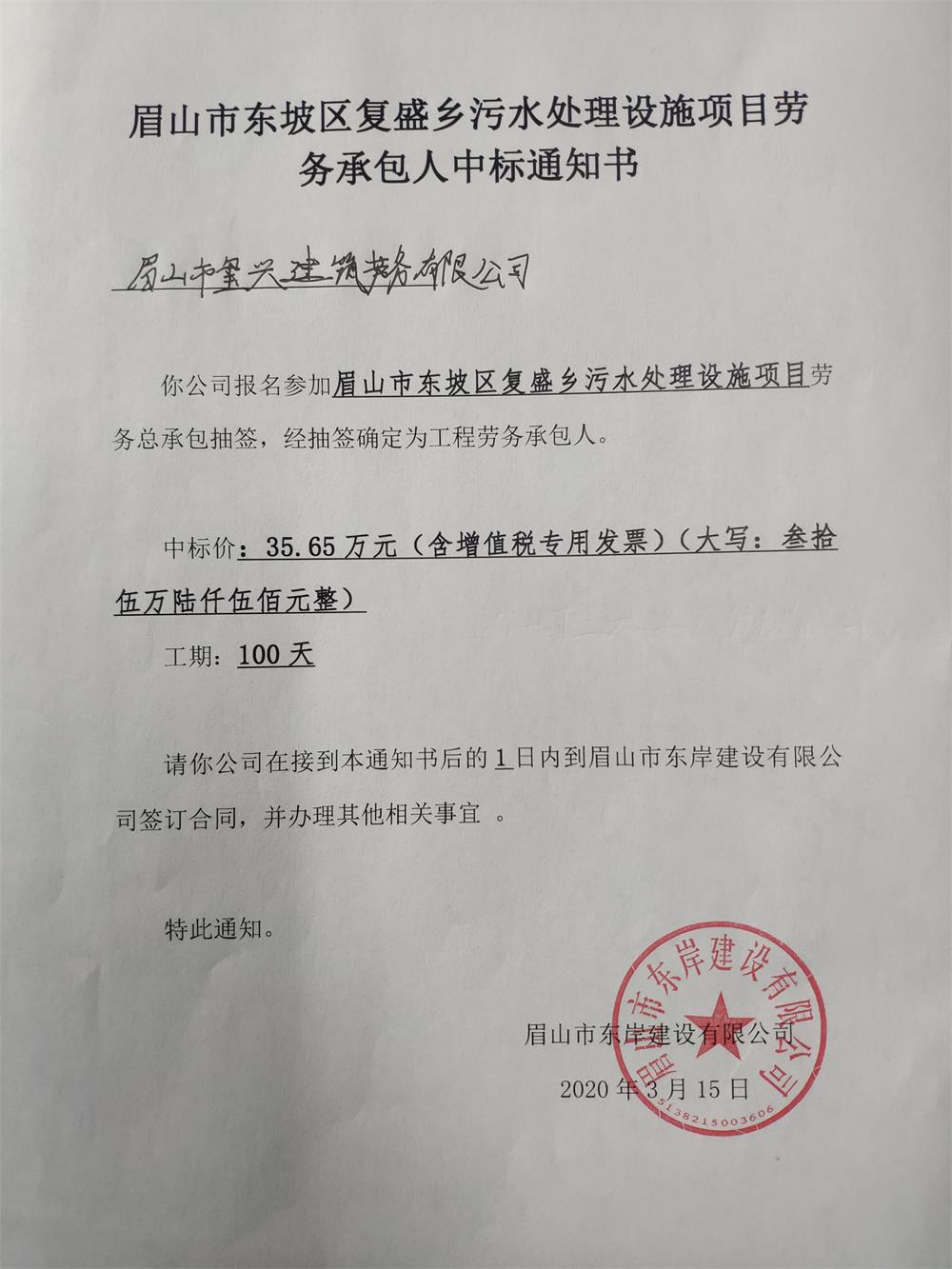 眉山市東坡區(qū)復(fù)盛鄉(xiāng)污水處理設(shè)施項(xiàng)目中標(biāo)通知