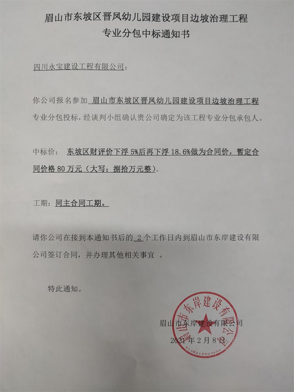 晉鳳擋墻專(zhuān)業(yè)分包中標(biāo)通知